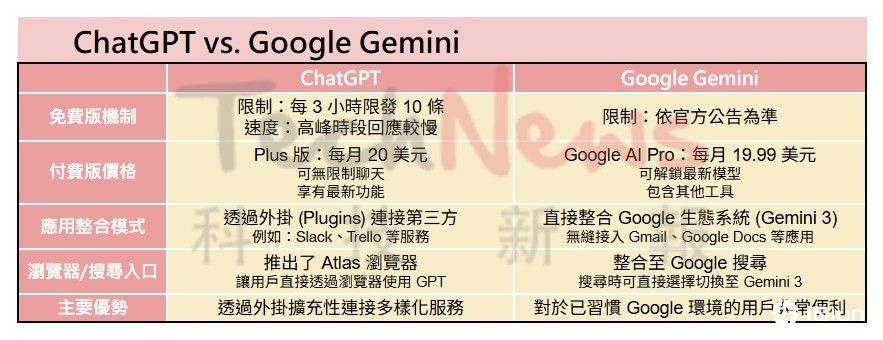 应用集成方面,ChatGPT能以插件与多种第三方服务连接,如Slack和Trello等,OpenAI最近推出Atlas浏览器也让用户直接用浏览器上GPT。Gemini 3直接集成至Google生态系统,无缝接入Gmail、Google Docs等应用,Google搜索时也能直接选择Gemini 3,对已生活在Google环境的用户本就是一大优势。