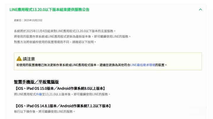 无法升级至这些系统版本的设备,将无法将LINE更新至13.21.0以上版本,因此在11月4日后无法继续使用LINE通讯或登录账号。