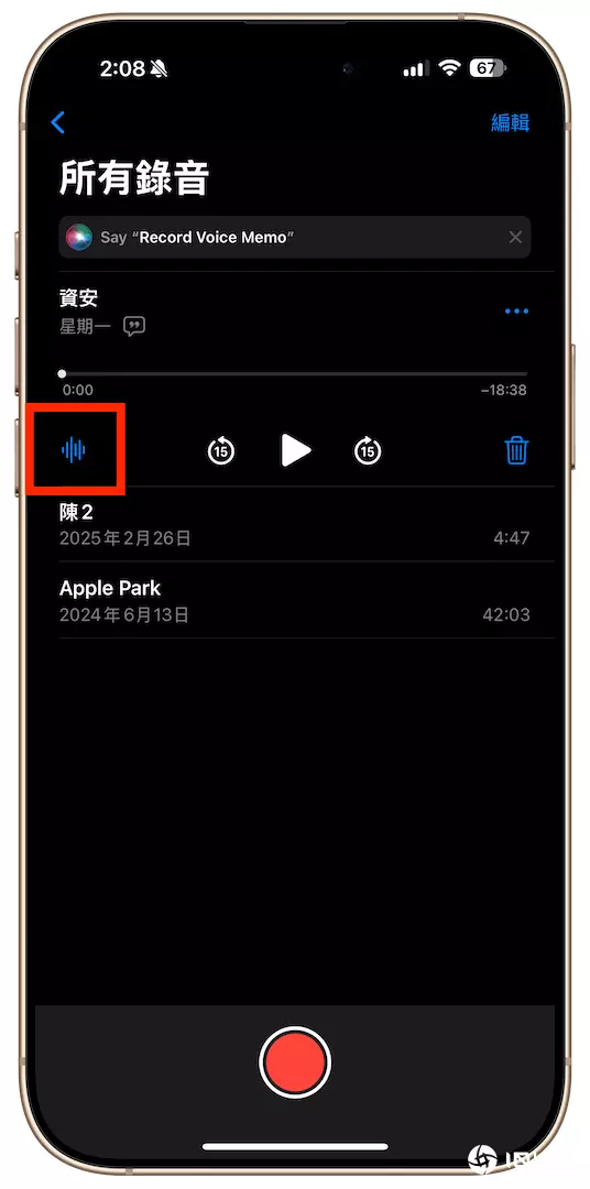 如果一切都已就绪,那么就开始录音吧!只要点击iPhone内置的“语音备忘录”App,并按下录音即可,无需额外的事先设置,当录音完成后看到录音的文件名下方出现一个小小的“对话框内有双引号”的符号(如下图红框处),这时就意味着这份录音频提供逐字稿。