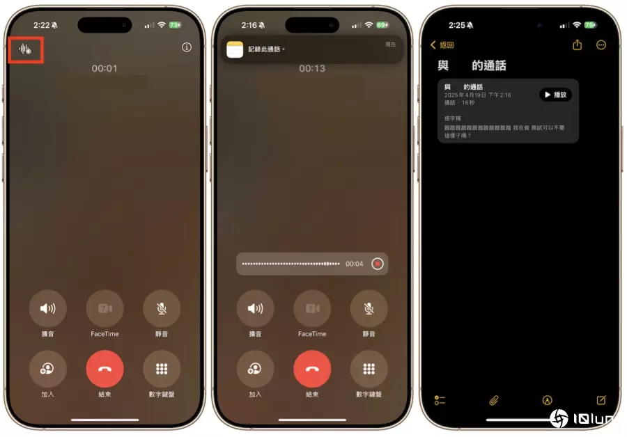 整体过程与早先的通话录音一样,在通话时点按左上角的声纹符号,按下后三秒即开始录音通话(双方都会听到录音通话的提示声),挂断后画面的最上方会跳出“记录此通话”的提示,可以点按该提示跳到“备忘录”中查看,在“备忘录”中可以重听这段通话,或是直接查看通话的逐字稿。