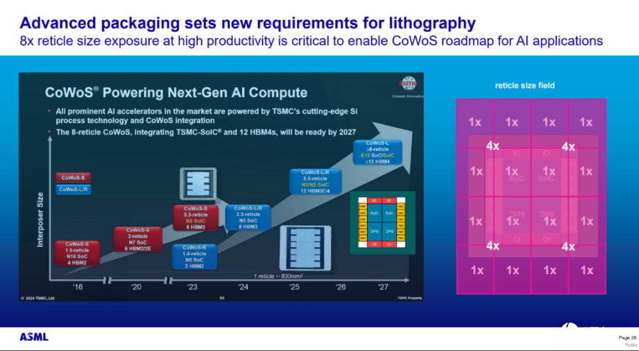 ASML指出,根据台积电(TSMC)的技术蓝图(Radow Map),业界普遍使用“光罩尺寸(reticle size)”来衡量中介层的大小。一个reticle size可以被视为一个单位的面积。目前业界的组装尺寸大约在3.x片到5.x片光罩大小的水准。然而,技术发展目标预计将做到大约八片光罩大小。对此,ASML强调,随着尺寸的增加,传统微影机台面临两大核心挑战。