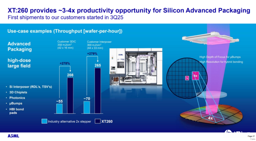 为应对上述挑战,ASML于2025年推出了XT:260新机台。这台新设备的核心突破在于显著扩大了曝光场的大小,从而使曝光效率获得大幅提升。根据ASML展示的数据显示,XT:260机台的D.P.(产出率)表现相较于竞争对手的设备呈现出大幅度的提升。此外,XT:260特别具备处理翘曲芯片的能力。这项技术突破使得机台能够适应因异质集成导致的芯片弯曲问题。