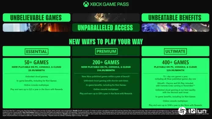 原有Xbox Game Pass Core重命名为Xbox Game Pass Essential,Standard计划则改为Xbox Game Pass Premium。Microsoft游戏及平台通信总监Dustin Blackwell表示,三个Xbox Game Pass计划均拥有更庞大游戏库,涵盖各层级PC游戏,Essential与Premium等级也添加不限时云计算游戏服务。