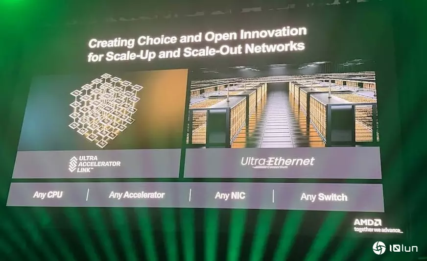 在Scale-Up部分,AMD同样是UA Link创始成员,目前已经开放核心互联架构“Infinity Fabric”,帮助UA Link联盟在产业中迅速增长。同时,AMD也宣布加入ESUN(Ethernet for Scale-Up Networks)联盟,目标是运用公用的以太网络,同时支持多种运行于其上的传输协议。