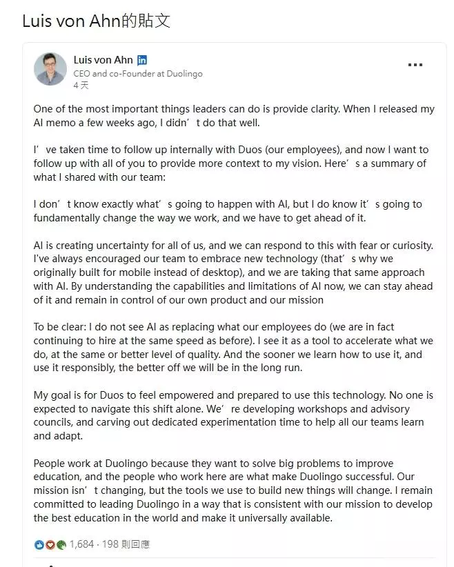 面对争议燃烧,Luis von Ahn近日在LinkedIn发文回应,强调AI将“辅助”而非“取代”人力,并表示Duolingo仍持续招聘,不会因导入AI而大幅裁员。
