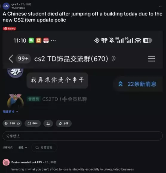 根据Reddit及多个社交媒体平台流传,中国一名学生疑因投资CS2饰品损失15万元人民币,疑用贷款入市,昨日于更新后传出自杀消息。事件引发舆论热议,不少网友及分析员痛批Valve人为导致市场崩溃,间接酿成悲剧。评论指“数以千计投资者把饰品当作资产,如今信心尽失,心理健康危机一触即发”。
