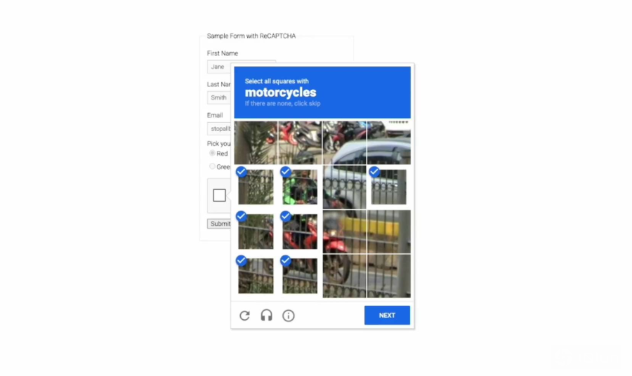 reCAPTCHA v2的三种类型挑战。静态 (Static)呈现一个静止的3x3网格;重新加载 (Reload)为动态地替换被点击的图像;跨格 (Cross-tile)则是使用一个4x4网格,物体可能横跨多个方块。