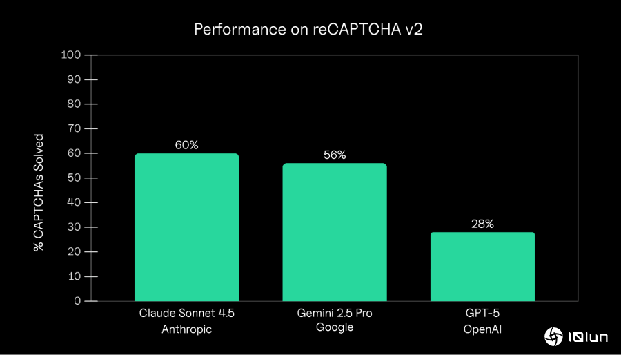 随着生成式AI快速进化,过去用来区分人类与机器人的CAPTCHA机制是否仍然有效,再度成为技术圈关注焦点。根据Roundtable Research研究指出,三大顶尖模型,Anthropic的Claude Sonnet 4.5、Google的Gemini 2.5 Pro、以及OpenAI的GPT-5,在挑战Google reCAPTCHA v2时展现截然不同的表现。研究显示,Claude的成功率最高,达60%;Gemini 2.5 Pro紧追其后为56%;GPT-5则仅有28%,明显落后其他两者。
