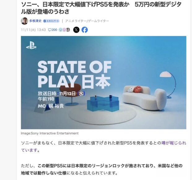 Sony随后宣布将于11月12日上午7时(日本时间)播出“State of Play日本”特别节目,节目将长达40分钟,重点介绍日本及亚洲地区开发的游戏。这项公告令传闻可信度大增,许多业界人士相信传闻属实。