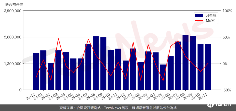 大立光公布11月总营收新台币53.03亿元,月减16%,年减12%;前11月累积总营收555.1亿元,年增长3%。预期后续,大立光表示,12月运营和11月差不多。