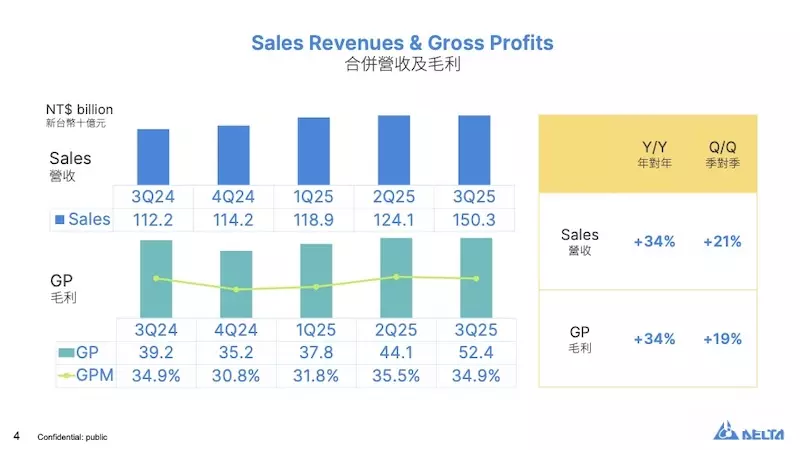 台达第三季总营收1,503亿元、季增21%、年增34%;毛利524亿元、季增19%、年增34%,毛利率34.9%与去年同期相同;营业净利248亿元、季增33%、年增51%;税后净利186亿元、季增33%、年增51%,每股盈余7.16元高于去年同期4.75元。