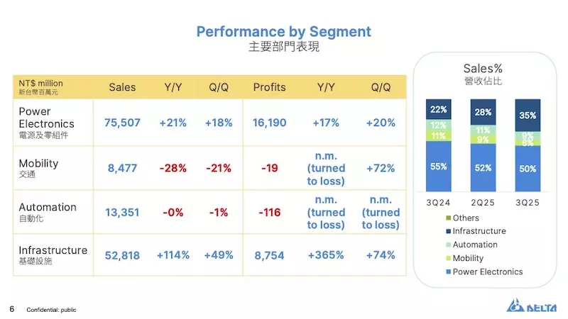 台达电四大部门第三季表现:电源及零部件(Power Electronics)营收755亿元、年增21%,获利162亿元、年增17%,基础设施(Infrastructure)营收528亿元、年增114%,获利超过87亿元、年增365%,营收增长来自电源及零部件、基础设施两部门的贡献。交通(Mobility)营收超过84亿元、年减28%,自动化(Automation)营收134亿元与去年同期持平,两部门皆有小幅亏损。