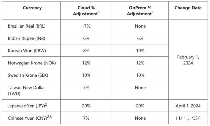 首先从2024年2月1日起,采取印度卢比、韩元、挪威克朗、瑞典克朗、台币收费的服务上调6%-12%。其中台湾的云计算服务收费上调7%,至于地端(On-Premises)部署的软件则未调价。