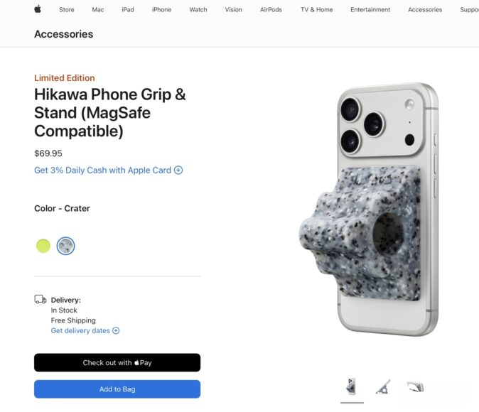 Hikawa Phone Grip and Stand售价69.95美元,现于美国Apple网上商店限量发售。此产品突显Apple推进无障碍科技创新,除了在软件层面添加点字笔记、即时字幕与头部关注操作等功能,也在硬件设计注重多样用户需求。