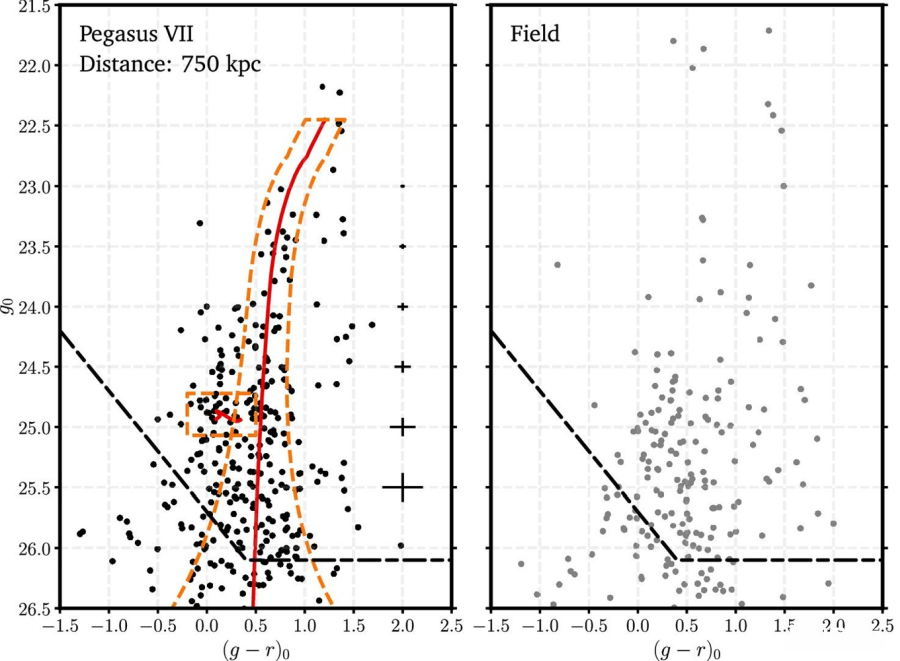 团队将形象恒星照亮度与颜色,搭建成星等─星色图。团队能识别出主序星、水平分支和红巨星分支,表示恒星大致在同时形成并经历数十亿年演化,确认这是一个新发现的矮星系!团队从飞马座VII识别出约82颗成员星,体积比仙女座星系小129倍;绝对星等为-5.7,仙女座星系绝对星等为-21.5,两者亮度差距200万倍。团队将附近其他星系的星等─星色图与飞马座VII比较,估算飞马座VII年龄约100亿年,金属丰度极低。