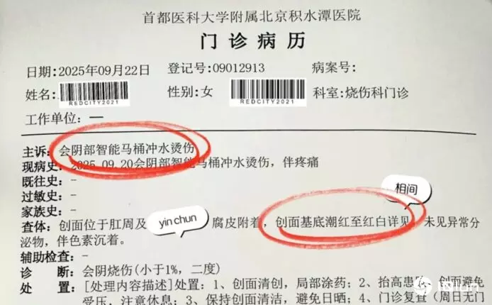 一名中国女子日前使用智能马桶时遭遇严重安全事故,声称在正常使用马桶3年后突然故障,喷出滚烫开水导致会阴部二度烧伤。事故发生时,事主按下冲洗按钮后系统出现卡顿,随即开始喷出冒烟的热水,令事主措手不及。