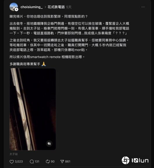 事主在社交平台Threads以“花式跌电话”为题发帖,分享17秒短片,并问网络用户估不估到佢影紧咩以及点影。佢喺等候港铁职员与车务中心协调期间,突发奇想利用手上Apple Watch连接掉落路轨的iPhone,遥控镜头拍摄。片段展示手机从路轨低处仰望,列车高速驶过的惊险画面。