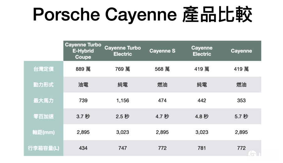 要跟纯电Cayenne比较性能的话,只有Coupe版本能追上,但就必须牺牲空间。(Source:科技新报制)