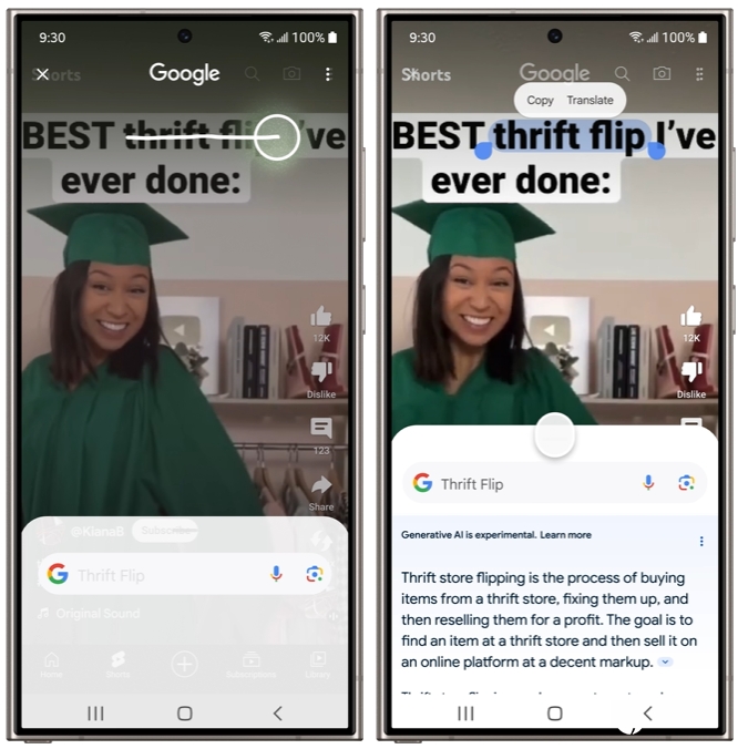 Circle to Search也支持多模搜索(multi-search)。Google Lens已经集成文本和图片搜索的能力,现在Google又为此功能加入AI强化。例如在看到炸热狗图片时,用户可以用手指圈选并问道“为何它这么受欢迎?”就能从网页上搜索到这东西的来源、做法、成分。或者用户看到YouTube短视频的标题(如“thrift flipping”)不太明了时,只要将文本画重点就能搜索并了解,这是从旧货店买衣服改造后再高价销售的行为。查询完资讯将之关闭就能继续看视频。