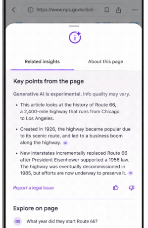 SGE while browsing的主要用意是协助用户浏览网站上的长篇内容,它利用AI来产生条列式的内容摘要,用户只要点击其中的某个摘要,便会连至与该摘要有关的内容。该功能仅限于公开内容,并不适用于具备付费墙的内容。
