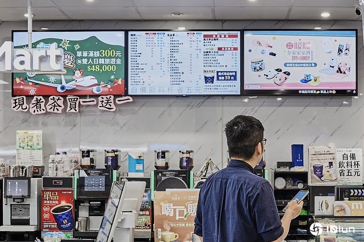 全家开始利用于实体门店渠道投放广告,包括自家门店电子看板,以及利用LBS营销技术在入店时推送广告到顾客通信软件。(图片来源/全家便利商店)