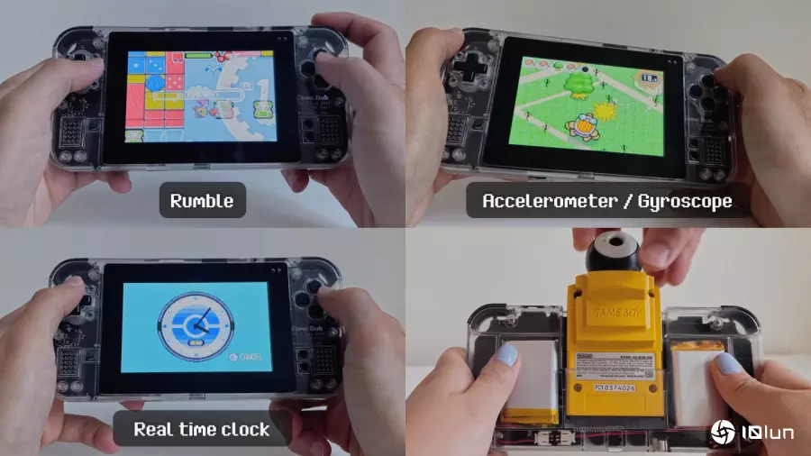 Game Bub内置震动、陀螺仪、时钟等功能,并支持Game Boy Camera相机。