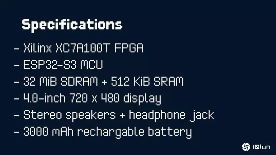 Game Bub的机身采用透明塑胶材质,硬件核心为具有101,400组逻辑组件(Logic Cell)与607.5 KB内存(Block RAM)的Xilinx XC7A100T FPGA,搭配辅助的ESP32-S3单片机以及32 MB SDRAM、512 KB SRAM等内存。 其屏幕为4英寸、720 x 480分辨率之IPS类型面板,具备立体声音箱与耳机端子,内置容量为3000 mAh的电池可以提供14小时的游戏续航力。