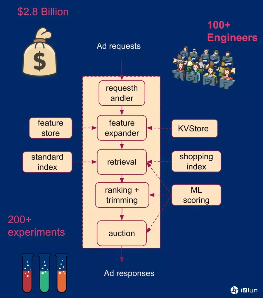 支持广告业务多元化、规模化的关键IT建设是,Pinterest内部开发的广告推荐系统。这是他们公司内数一数二庞大和复杂的核心系统,负责从广告请求处理、检索候选、排序相关性,一路到竞价、投放等广告流程。
