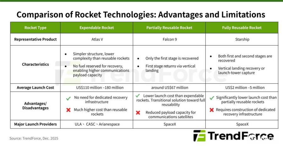 TrendForce指出,受益于Starlink卫星群部署及美国太空军固定任务,SpaceX正由部分回收迈向全面回收阶段。全球大厂也同步加强相关验证,希望能大幅下调火箭发射成本。在回收本体与燃料更替影响下,欧洲Arianespace、Mitsubishi Heavy Industries与中国CASC等传统发射方,也强化一级回收与垂直降落测试部署。