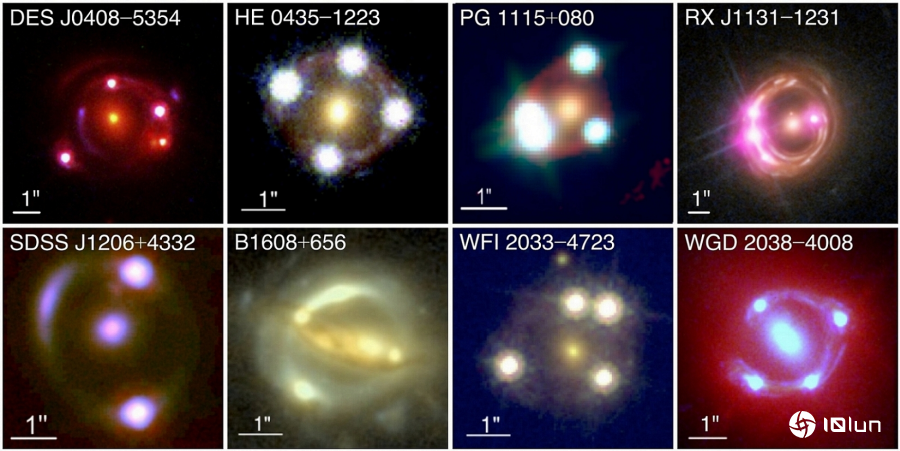 TDCOSMO-2025分析使用的八个多重形象类星体系统。每格形象右下角白色刻度棒代表1角秒(1″),约在月球看一个2米高的人。形象由哈勃太空望远镜(HST)、Keck望远镜NIRCAM、钱德拉拉X射线天文台拍摄,可用波段不同,故以假色合成呈现细节。八个系统分别为:DES J0408-5354──Shajib et al. (2020);HE 0435-1223、B1608+656、WFI 2033-4723 — Suyu et al. (2017);PG 1115+080、SDSS J1206+4332──Wong et al. (2020);RX J1131-1231──Shajib et al. (2024)。(Source:NASA/ESA/Chandra;WGD 2038-4008──Shajib et al. (2022))