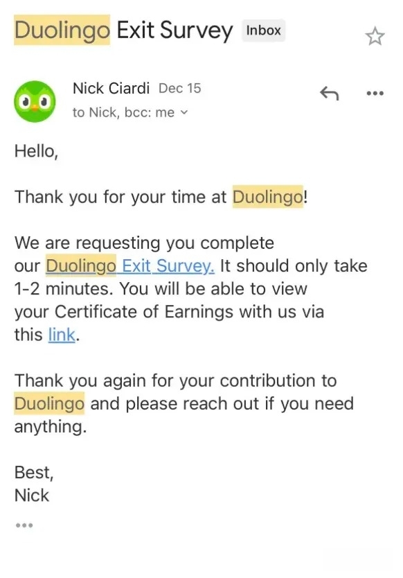 据悉,Reddit平台上一位被辞退的约聘员工贴出了Duolingo HR发给自己的辞退邮件,证实了多邻国正对“外包翻译工”动刀。