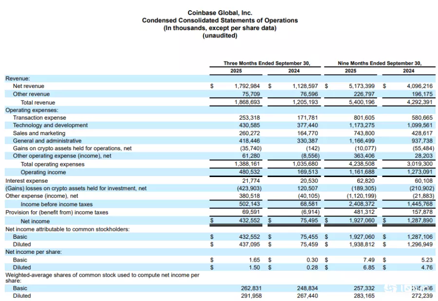 根据Coinbase公布的财报数据,2025年第三季,营收从去年同期的12.1亿美元增至18.7亿美元,优于分析师预估的18亿美元;净利激增至4.326亿美元,即每股盈余1.50美元,不仅明显优于分析师预期的1.10美元,也远高于去年同期净利7,550万美元,即每股盈余0.28美元。