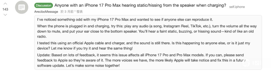 近期有iPhone 17 Pro与iPhone 17 Pro Max用户在社交媒体论坛与外国论坛Reddit上反映,手机在充电中会从音箱传出轻微的静态噪音或嘶嘶声,声音类似老式收音机的底噪;多数描述指出噪音在充电状态下更容易被发现,且在安静环境中特别明显。