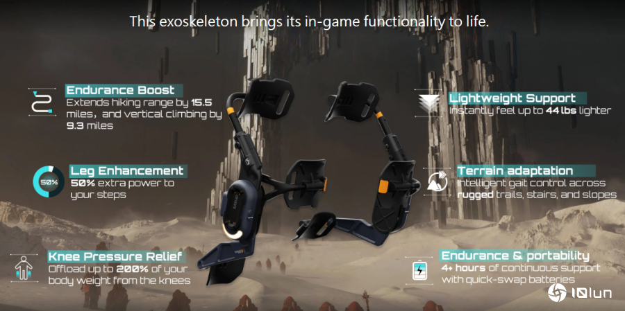 设备具备以下特色:将徒步范围扩大15.5英里(约25公里),垂直攀登范围扩大9.3英里(约15公里);为用户的步伐增加50%额外动力;减轻膝盖承受最多200%的体重;瞬间感觉轻了最多44磅(约20公斤);在崎岖小径、楼梯和斜坡上进行智能步态控制;使用可快速更换的电池提供4小时以上连续支持。