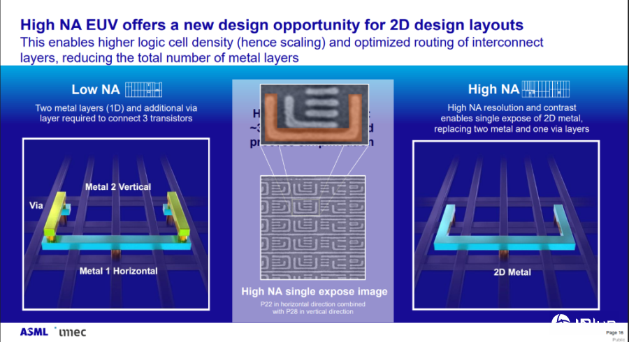 ASML表示,HNA技术的核心优势在于其效率和成本节省。若使用传统的Low-NA EUV (LNA) 技术,要铺设某些图案可能需要经过三次LNA曝光步骤。然而,若使用HNA,实际上可以用一次互工的方式,取代原本的三张光罩或三次曝光。这项改进带来了显著的省时和省成本效益。此外,HNA能够实现过去相当难做的“2D大图案”(2D big pattern)曝光。传统曝光方式通常限制在1D(直线或横线)的图案,而HNA的出现使得2D图案的曝光成为可能。