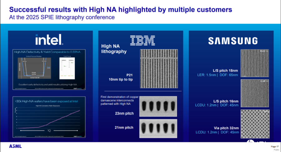 而在客户采纳方面,ASML透露,包括Intel、IBM以及三星等多家主要半导体制造商正在使用HNA。其中,Intel的公开声明指出,HNA在瑕疵率(defectivity)和良率(yield)上,基本上已做到与LNA相同的水平。鉴于HNA目前仍处于初期发展阶段,这显示其具有实现更好性能的巨大潜力。ASML对HNA的市场采用情况表示非常有信心。