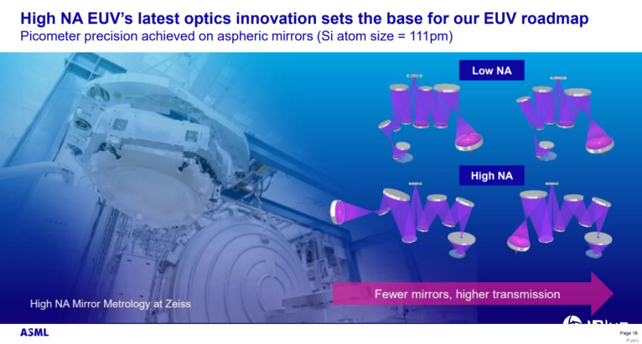 ASML指出,HNA与LNA之间最主要的设计差异在于镜片或镜面的设计。HNA通过减少镜面数量来优化系统。这一设计至关重要,因为每一次光线在镜面上的反射都会导致光源损耗,例如100的光源进入后,第一次反射可能只剩90,再出来可能只剩81,损耗不断累积。因此,镜面数量越少,对系统性能的表现越有利。另外,EUV光线本身具有特殊性,它无法在空气环境中存在,因为会被空气吸收。因此,EUV设备中的所有光学组件(镜子)表面都经过多层处理,大约镀有80层材料以减少损耗。