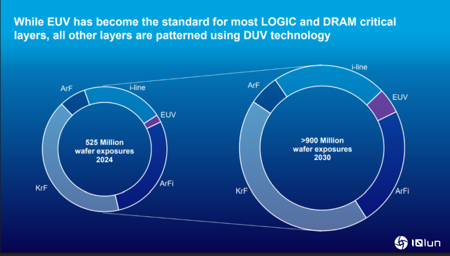 尽管EUV技术在处理芯片底部最关键的结构上至关重要,但从总体曝光量(Volume)来看,绝大部分的芯片处理仍是通过DUV(深紫外光)进行曝光的。根据统计,虽然EUV的重要性日益增加,但从2024年的占比来看,EUV仍然只占整个芯片曝光量中的一小块。DUV和其他产品线的经济效益对ASML而言至关重要,因为客户很大一部分的生产成本仍然集中在DUV这一块。