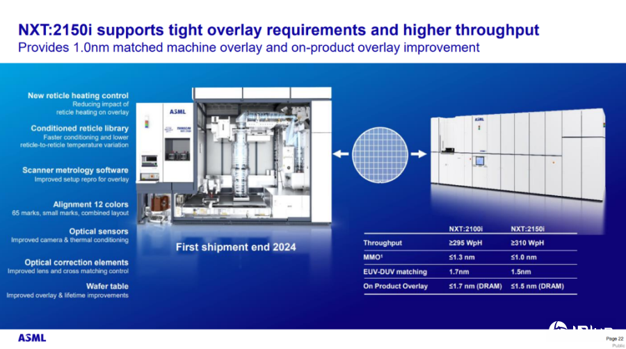 所以,ASML的DUV产品线持续升级。首先在浸润式(Immersion)微影部分,最新机台为2150。该机台的性能显著提升,每小时芯片处理量(WPH)可达到约310片。其机对机套准(MCH machine overlay)相较前一代也有显著提高。另外,也开发出KRF DUV机台。因为KRF DUV仍是非常重要的机台,已于2024年底开始出货。其生产效率更高,WPH可超过400片/小时,速度极快。