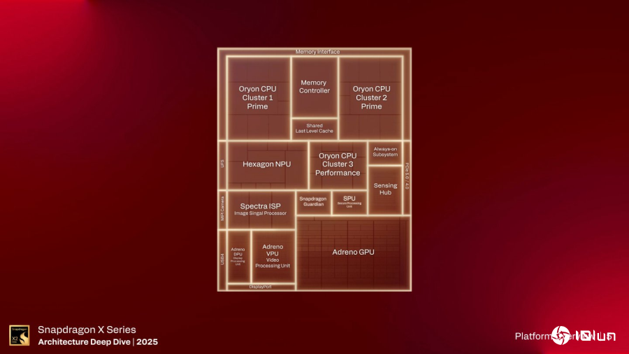 Snapdragon X 2平台的处理器(CPU)部分最多可以配置2组性能较高的6核心Prime集群(概念类似Intel处理器之P-Core),以及1组电力效率较高的6核心Performance集群(类似E-Core),达到最高18核心的组态,并集成Adreno绘图处理器(GPU)以及Hexagon神经处理器(NPU)。特别的是它与Intel的Lunar Lake处理器一样将内存与SoC封装在单一芯片,具有能够节省空间、传输功耗,并提高传输性能的优点,但不同的是Snapdragon X 2平台还能额外扩展LPDDR5内存,以满足更高端的使用需求。