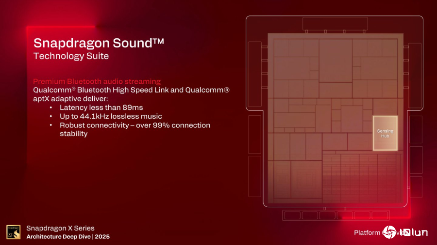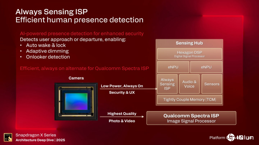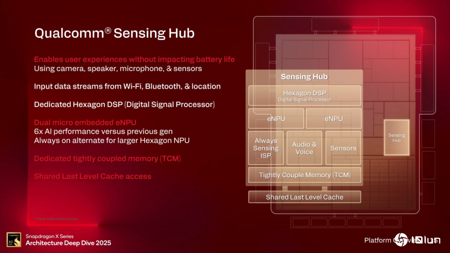 为了让设备在待命或睡眠状态时摄影机、音箱、麦克风、无线网络、蓝牙、定位等时常感知功能可以在省电的前提持续运行,Snapdragon X 2平台添加了称为Sensing Hub的感知中心,内部具有轻量的数字信号处理器(DSP)、eNPU、内存,能够执行简单的功能。