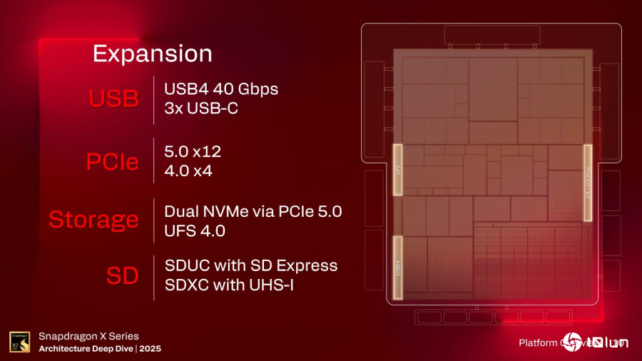 Snapdragon X 2平台提供3组USB4端子,12条PCIe Gen 5信道以及4条PCIe Gen 4信道,支持最多2组NVMe协议PCIe Gen 5x4固态硬盘,以及UFS 4.0存储媒体、SD Express与UHS-I规范之SDUC、SDXC内存卡。