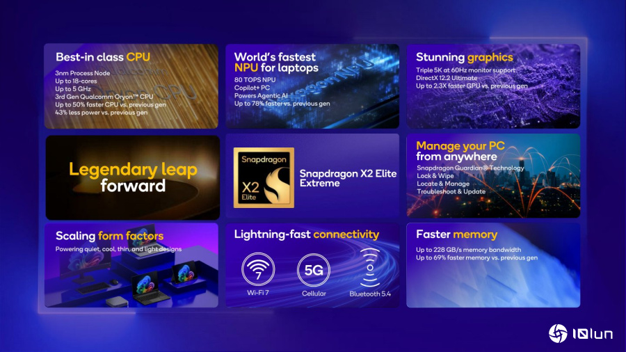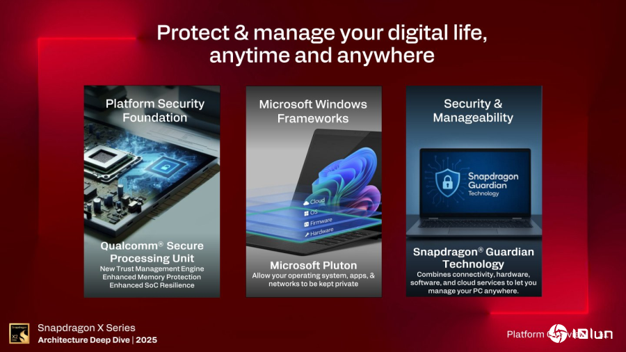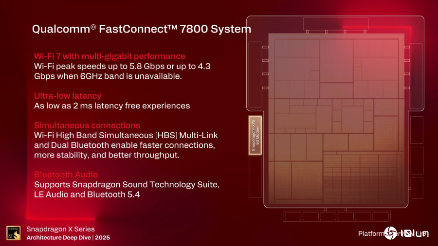 Snapdragon X 2平台也集成Wi-Fi 7无线网络、蓝牙5.4无线传输、5G移动网络等通信功能,Snapdragon Guardian可以提供远程管理与升级、寻找设备、清除设备数据、远程操作等安全高端功能。