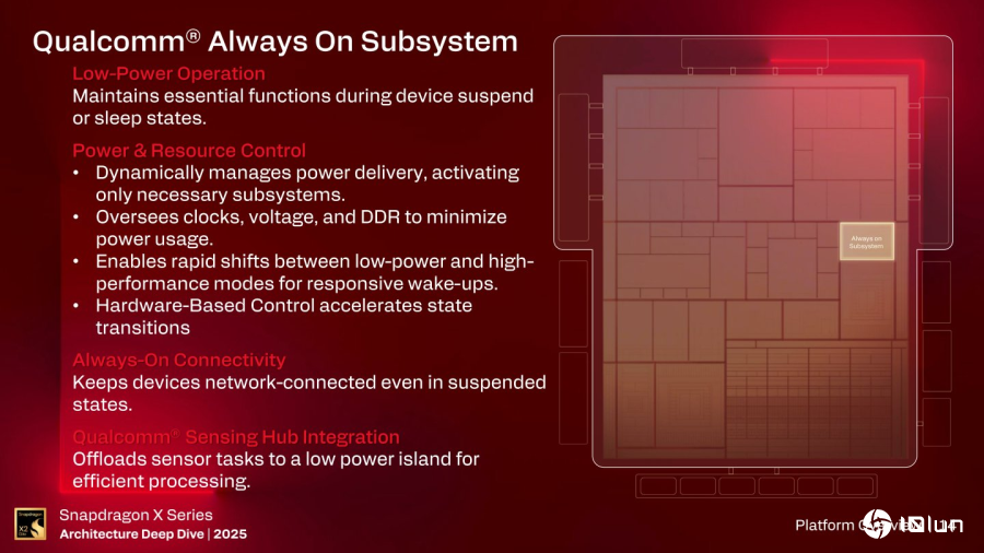 Snapdragon X 2平台集成了时常打开子系统(Always-On Subsystem),顾名思义可以在设备待命或睡眠状态提供时常联网与特定功能,并可将传感器的运算负载转移至低功耗运算单元。此外也提供处理器、内存之动态性能调整,以发挥省电功效。