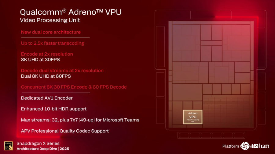 Adreno VPU形象处理器支持双路8K60p解码以及单路8K30p编码,并支持独立AV1格调编码器与强化的10 Bit HDR,最高能够同时进行32路视频会议,若使用Microsoft Teams则可达49路。