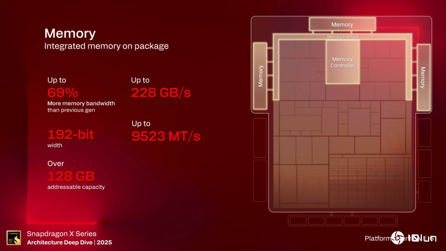 Snapdragon X 2平台的内存控制器最高支持LPDDR5-9523,带宽可达228 GB/s,并支持128 GB以上的内存寻址能力。