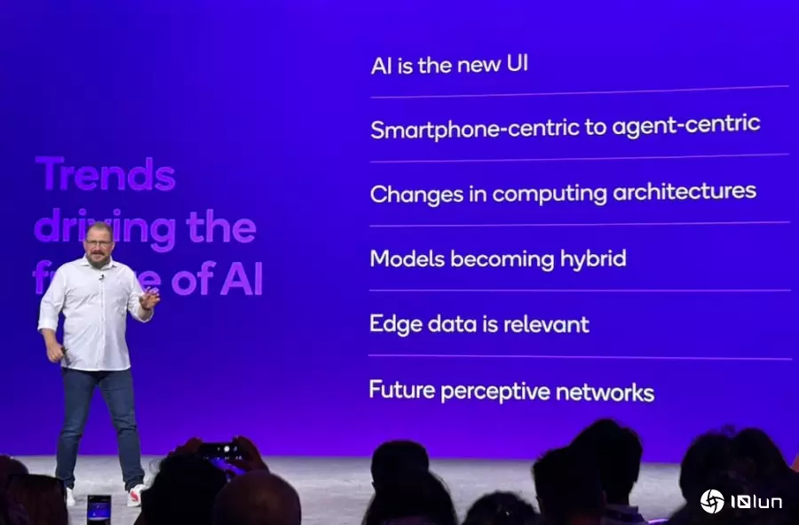 阿蒙认为,AI在云计算负责处理复杂和密集型任务,边缘运算则有即时、场景化等特点,他也分享AI趋势下的六大趋势,分别是:AI成为新的用户界面、从智能手机转向AI智能体(Agent-Centric)、运算架构改变、混合模型成趋势、边缘数据相关性,以及未来感知网络兴起。