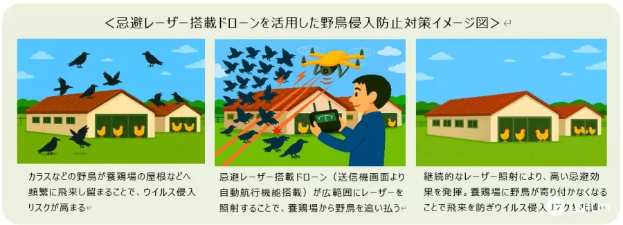 这个创新技术是由NTT e-Drone Technology有限公司与NTT东日本公司及千叶县政府共同开发的,目的是通过激光驱赶野生鸟类,减少不必要的鸟类如乌鸦和鸽子进入农场,降低禽流感的传播风险。