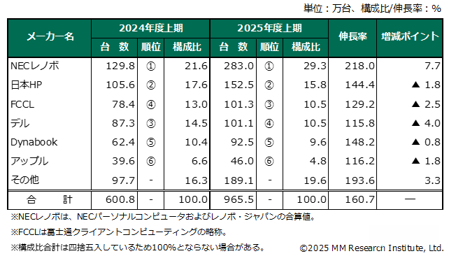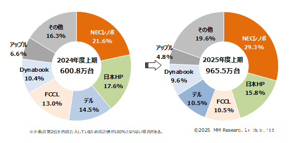 日本ICT市场调查咨询机构MM总研(MM Research Institute)公布调查报告指出,因微软(Microsoft)Windows 10在2025年10月终止支持推升商用PC换机需求,加上“GIGA School构想”(日本全国中小学每位学生配置一台计算机设备)换机需求显现,带动2025年度上半年(2025年4-9月)日本PC出货量较去年同期飙增60.7%至965.5万台,就半年度别情况来看,超越2013年度下半年的960.1万台,创1995年度开始进行统计以来历史新高纪录。