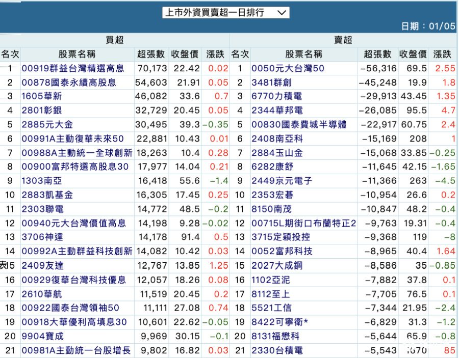 观察外资买卖超排行,买超火力集中在高股息ETF,外资买超群益台湾精选高息(00919)超过7万张居冠,再来买超国泰可持续发展高股息(00878)5.4万张排第二,最后则是买超华新4.6万张居第三。